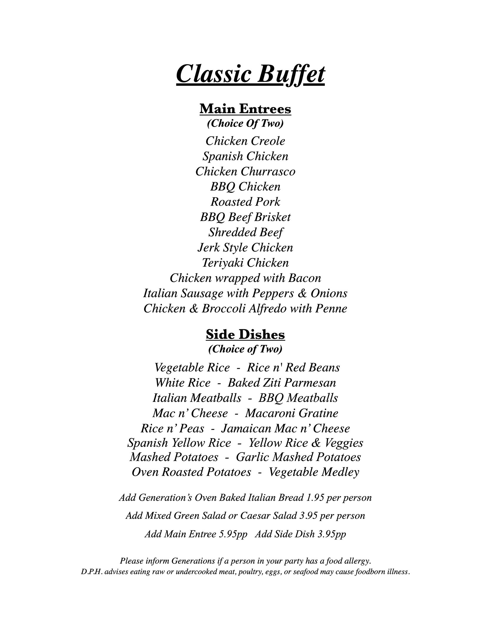 • $3.95pp - Vegetable Rice, Vegetable Medley, Honey Glazed Carrots, Oven Roasted Potatoes, Mixed Green or Caesar Salad (no dressing)